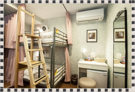 お部屋は2段ベットのかわいらしいドミトリータイプ※2段ベットの1ベットをご利用いただく相部屋です